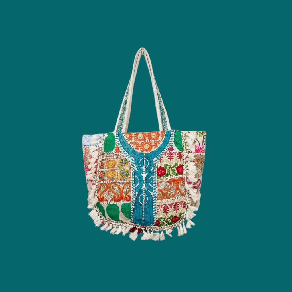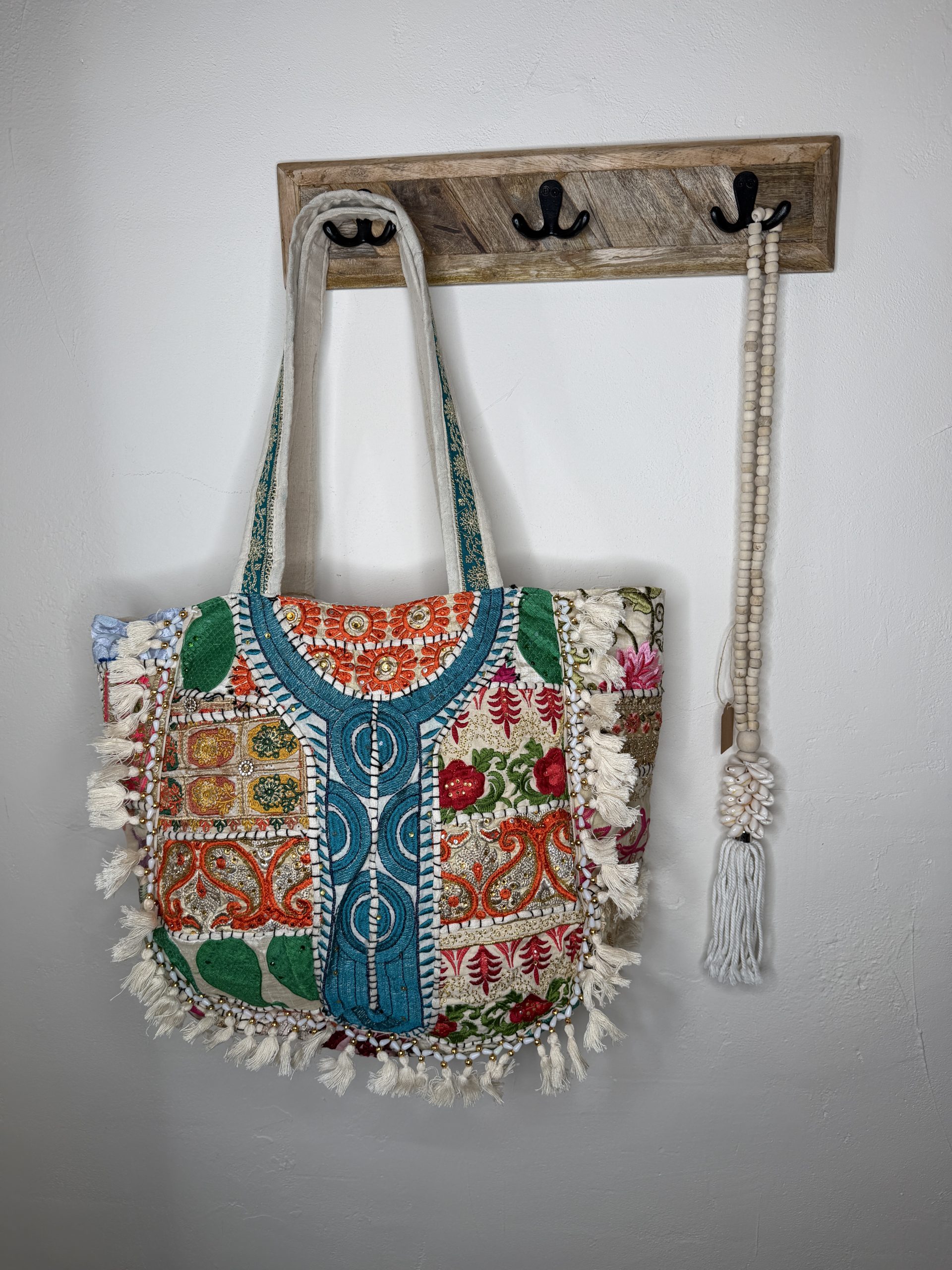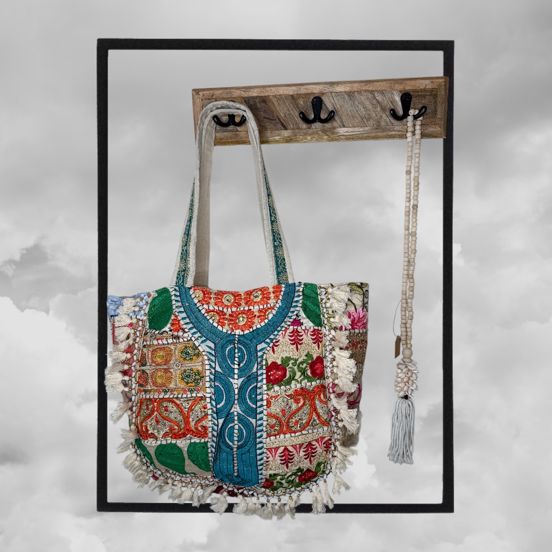 Deze prachtige boho shopper is een echte eyecatcher dankzij het rijke patchwork design, verfijnde borduursels en speelse franjes. De mix van warme kleuren en vrolijke patronen geeft de tas een unieke bohemian uitstraling die elke outfit nét dat beetje extra geeft.